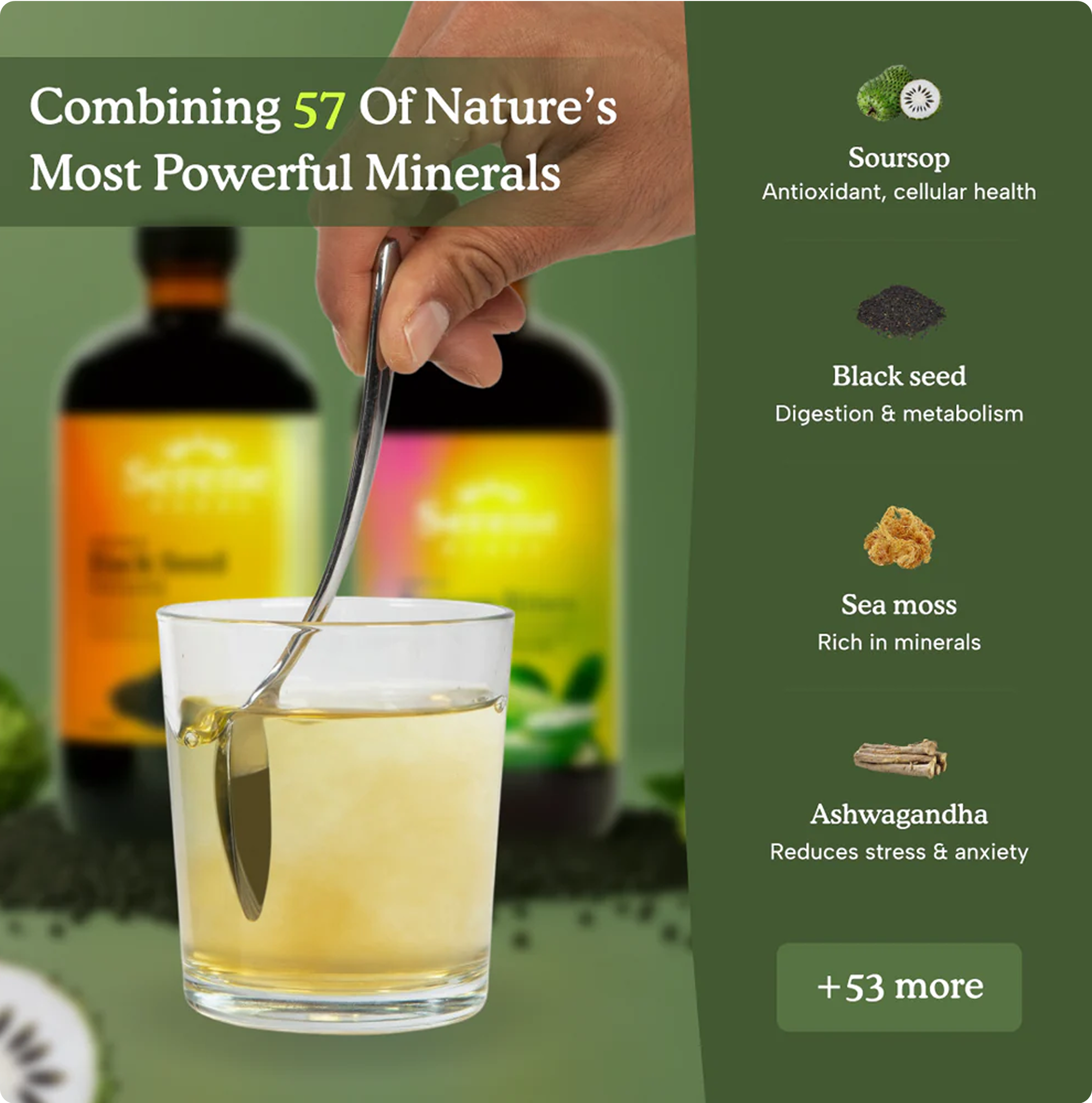 What makes Serene Herbs Bitters so powerful isn't just Soursop and Black Seed — it's the full-spectrum blend of 57 carefully selected botanicals, each chosen for a reason.