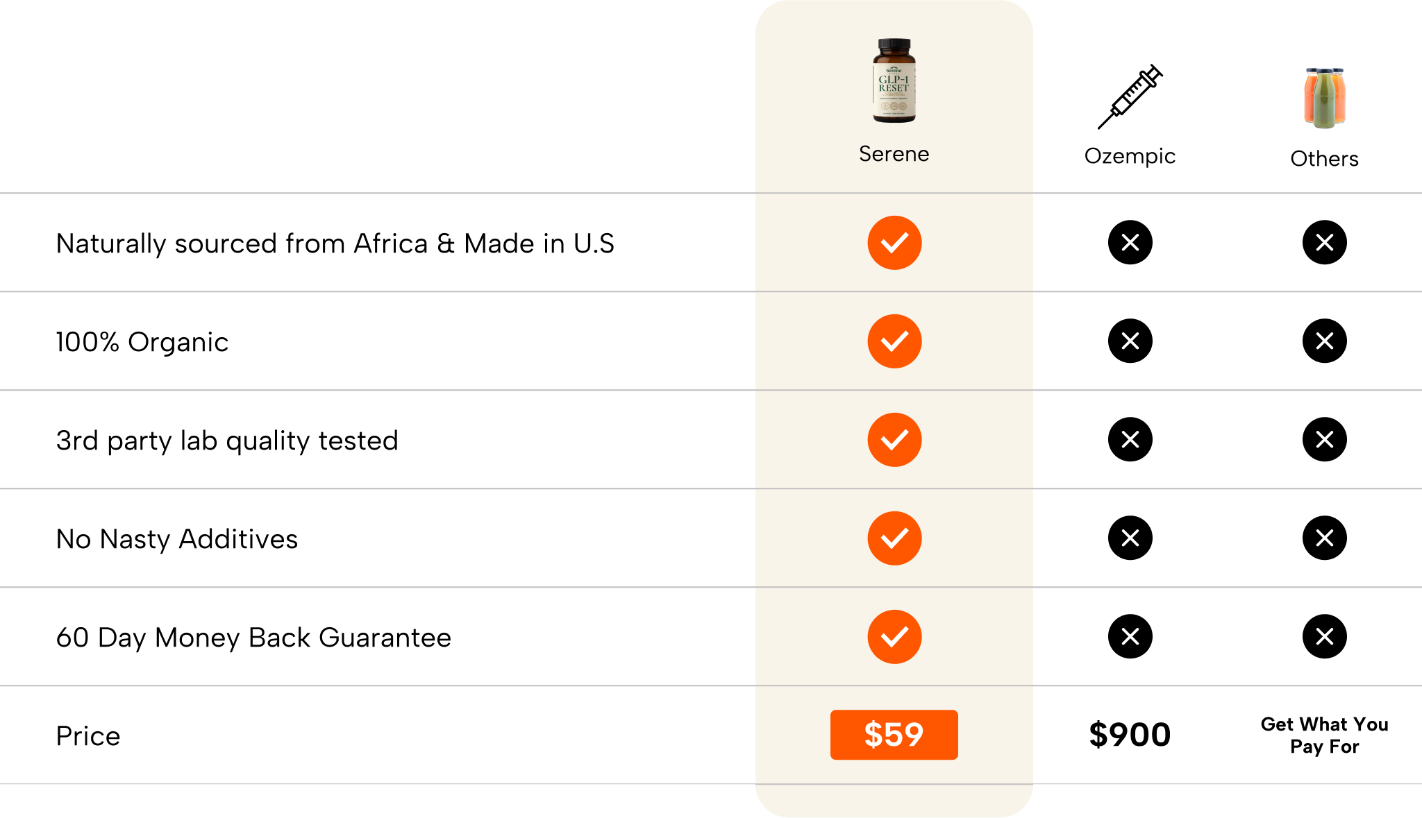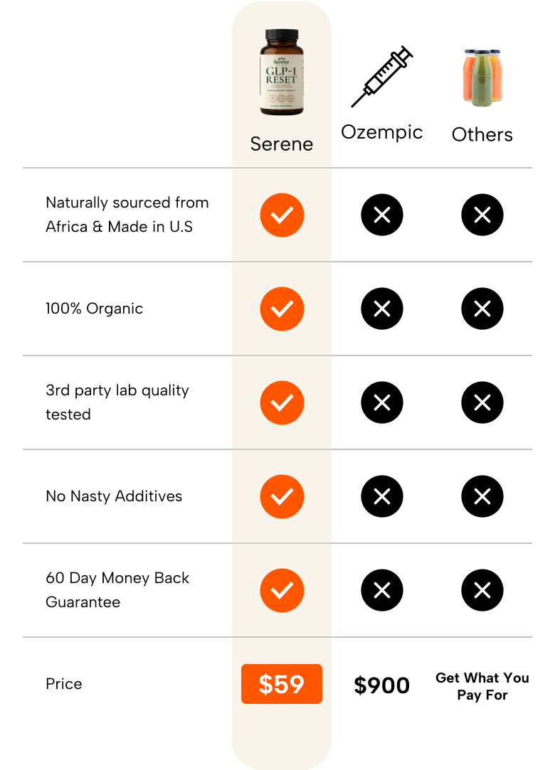 Serene GLP-1 based on probiotics and plant extracts that stimulates the production of the hormone GLP-1, which may reduce appetite and control weight.